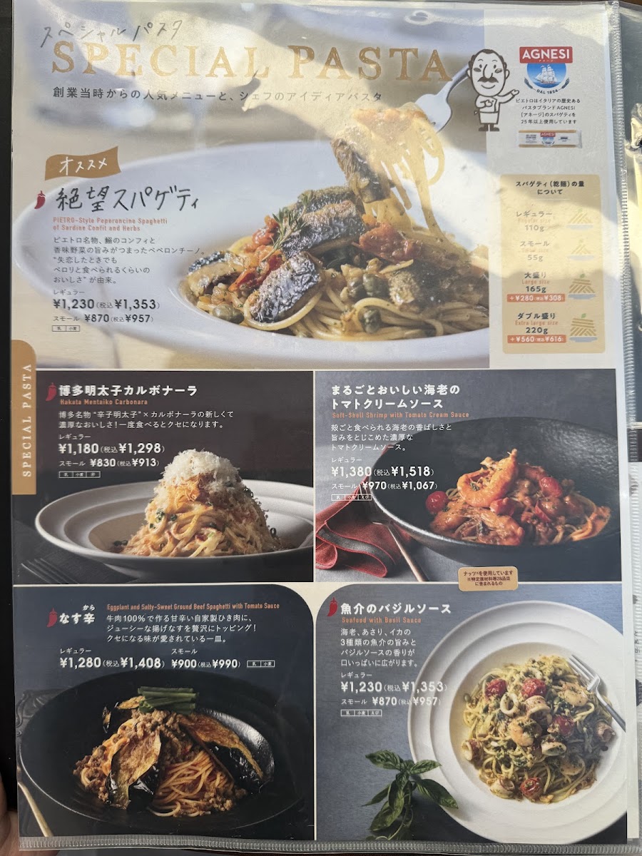 The menu at Yomenya Pietro Kokura Sunatsu offers a delightful range of dishes, perfect for anyone looking to experience the flavors of Japan with a twist. Their Seasonal Menu is a standout, featuring a special, limited-time Tarako Fair Menu, designed to showcase the rich, savory taste of tarako, or cod roe. For those wanting a complete meal, you can add the SET option, which includes a side of soup and bread. During weekdays, between 11:00 AM and 3:00 PM, the restaurant offers the Pietro Lunch Set, available exclusively during lunch hours. The Grand Menu presents options like the decadent Special Pasta, which features a rich blend of four cheeses and is served with honey for a perfect balance of savory and sweet. For added convenience, the restaurant offers takeout, with all dishes provided in containers and recommended to be consumed within one hour for the best taste experience. Whether dining in or on the go, the menu at Yomenya Pietro Kokura Sunatsu promises something special for every palate.